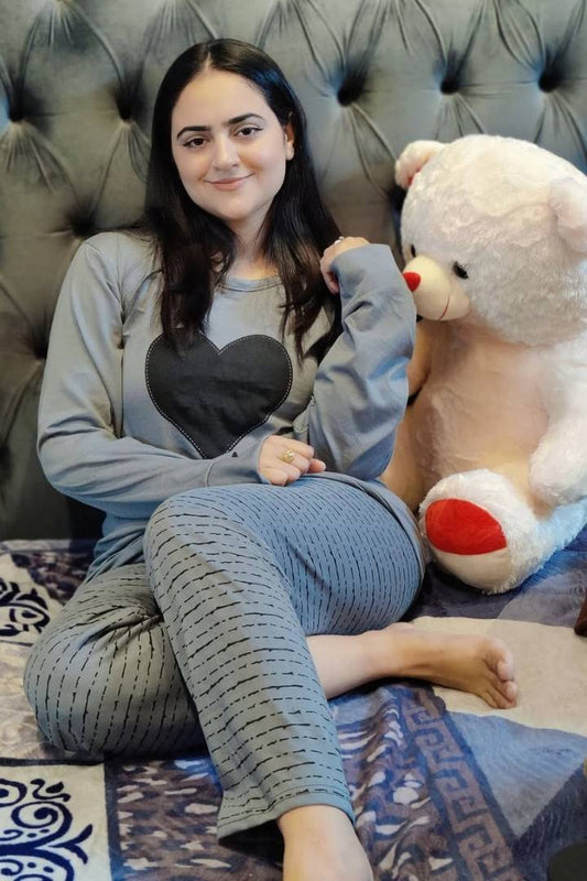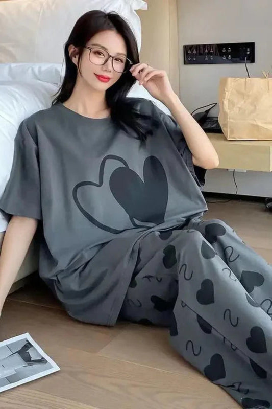 Grey Black Heart Print Night Suit