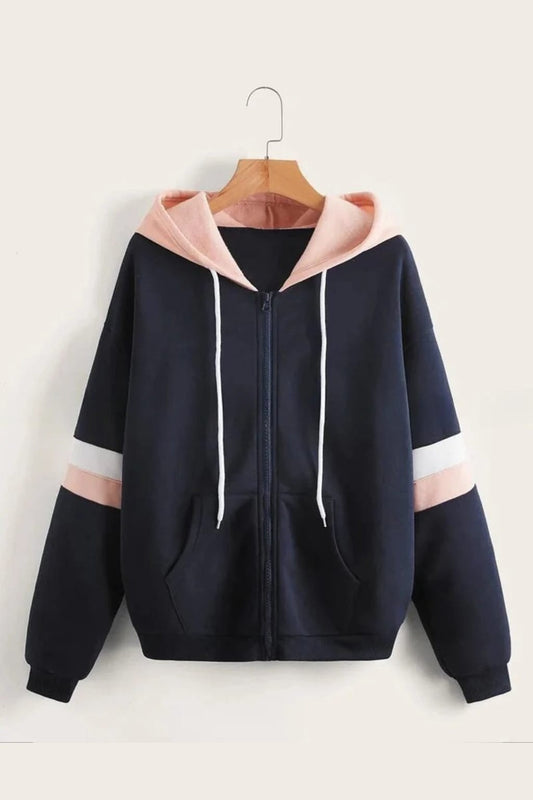 Navy Blue with Pink and White Stripes Zipper Hoodie